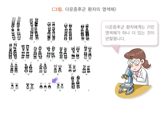 말초혈액 염색체검사를 통해 21번 삼염색체를 확인하여 다운 증후군을 확진합니다.