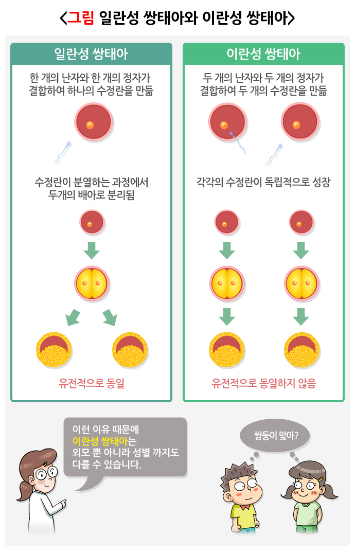 일란성 쌍태아는 하나의 난자와 하나의 정자가 수정된 수정란에서 발생하므로, 성별을 포함해 유전적으로 동일한 아이들이 태어납니다. 하지만 아주 드물게 돌연변이에 의해 유전적으로 다를 수도 있습니다.