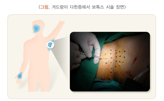 피부 내에 보톡스를 주사하게 되면 에크린 땀샘에 분포하는 교감신경의 말단부에서 아세틸콜린의 분비가 억제됩니다. 보톡스의 효과는 8~9개월 정도 지속되며, 겨드랑이 다한증의 경우 90% 이상에서 효과가 나타납니다. 손발 다한증의 경우에도 성공적으로 사용됩니다. 두경부, 안면부 다한증의 경우 일차 약제로서 보톡스가 사용됩니다. 안면부 다한증의 경우, 이마에 국한된 다한증이나 음식을 씹을 때 볼에서 땀을 흘리는 플라이 증후군과 같은 질환에 보톡스가 사용됩니다.