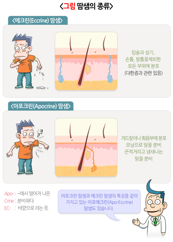 반면, 아포크린 땀샘은 비교적 숫자가 적고 주로 겨드랑이나 회음부에 분포합니다. 아포크린 땀샘은 주로 모낭으로 땀을 분비합니다. 끈적거리고 냄새나는 땀을 분비하고, 다한증에 미치는 영향은 미미합니다. 최근에 아포에크린 땀샘이라는 새로운 종류의 땀샘이 보고되었는데, 주로 성인의 겨드랑이에 분포하면서 아포크린 땀샘과 에크린 땀샘의 형태와 기능을 모두 가지고 있는 것으로 알려져 있습니다. 아포에크린 땀샘은 겨드랑이 다한증에 영향을 주는 것으로 생각하고 있습니다.