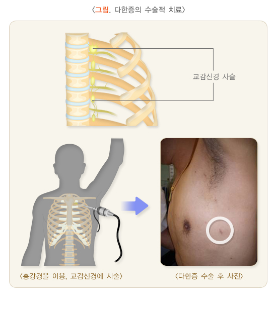 교감신경은 자율신경계의 한 부분으로 평활근과 심근, 땀샘 등에 대한 신경 지배를 담당하고 있습니다. 다한증의 수술적 치료는 흉강 내에 존재하는 교감신경을 절단하는 시술을 말하며, 약 100년 전부터 최근까지 여러 가지 형태로 변형되어 시행되고 있습니다.