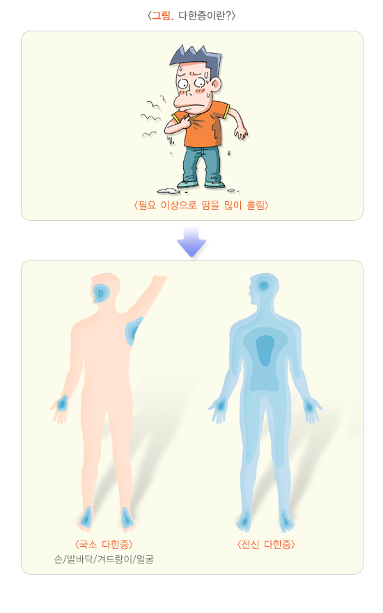 다한증은 땀이 나는 부위에 따라 국소 다한증과 전신 다한증으로 나눕니다. 대부분의 환자는 손이나 발바닥, 겨드랑이, 얼굴와 같은 특정 부분에 과도한 땀이 발생하는 국소 다한증이며, 특별한 원인 질환이 없는 경우가 많습니다. 전신 다한증은 전신적으로 많은 땀이 발생하는 것으로, 기저 질환이 동반되어 있는 경우가 많습니다.