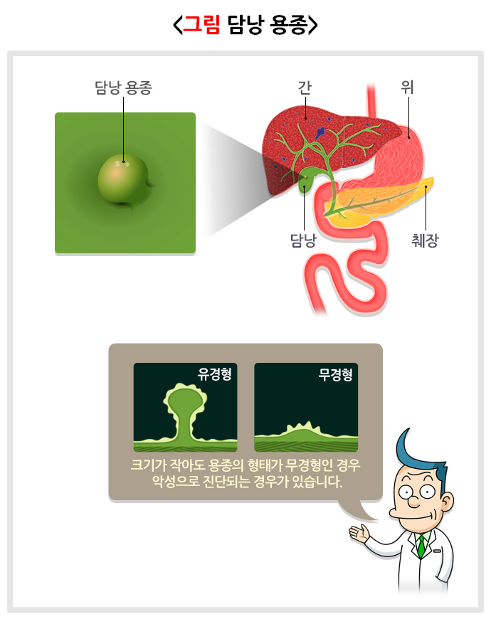 담낭 용종은 담낭 점막에 융기된 병변으로 담낭의 용종성 병변이라고도 합니다.