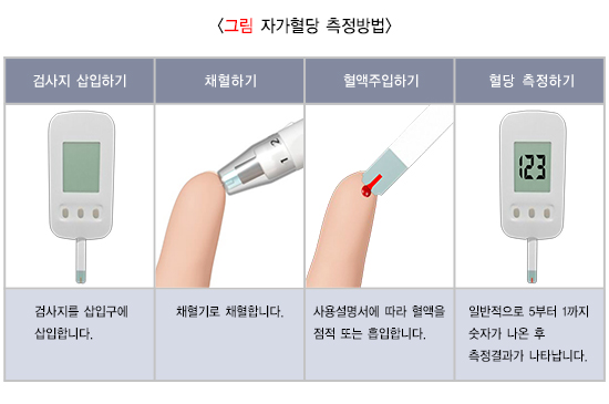 • 당뇨병 환자에서 혈당 조절을 평가하는 주된 방법은 일상생활 중에 자가혈당측정과 당화혈색소 검사를 시행하는 것입니다. 자가혈당측정이 환자 측에서 제공하는 혈당조절 지표라면, 당화혈색소는 의료진이 제공하는 혈당조절 지표입니다.