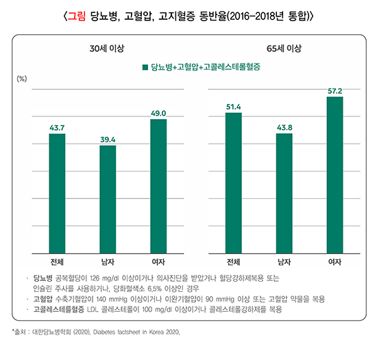 • 당뇨병 환자는 심혈관질환을 예방하는 것이 매우 중요합니다. 심혈관질환의 위험인자를 평가하고 적절히 관리해야 합니다. 심혈관질환의 위험인자는 연령(남자 45세 이상, 여자 55세 이상), 고혈압, 흡연, 관상동맥질환 조기 발병 가족력(남자 55세 미만, 여자 65세 미만), 이상지질혈증(LDL(low density lipoprotein, 저밀도 지단백질) 콜레스테롤이 높거나, HDL(high density lipoprotein, 고밀도 지단백질) 콜레스테롤이 높을 때) 등입니다.