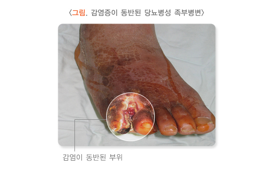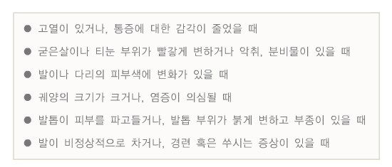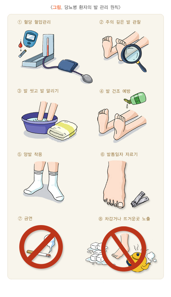 당뇨병 환자의 발에 문제가 생겼을 경우에는 반드시 전문 의료진의 진료를 받아야 합니다. 일부 환자의 경우 발에 생긴 물집을 소독되지 않은 핀셋이나 칼 또는 이쑤시개 등으로 건드리거나, 굳은살이나 티눈을 칼이나 화학 약품을 이용해 제거하려 하는 경우가 있는데, 이는 매우 위험한 행위입니다. 잘못하면 상처를 악화시키고 이차적인 감염이 생길 수 있으며, 조그만 상처를 크게 키우는 결과를 초래할 수 있습니다.