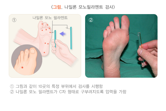 특히, 나일론 모노 필라멘트(Semmes-Weinstein monofilament) 검사는 빠르고 간단한 검사법으로, 가는 나일론 실로 발바닥과 발등의 특정 위치에 가해서 압력 감각이 정상인지를 평가하는 방법입니다. 감각을 느낄 수 없는 부분이 많다면, 압력 감각이 감소했다고 할 수 있으며, 이것은 발 궤양이 생길 위험성이 높다는 것을 의미합니다.