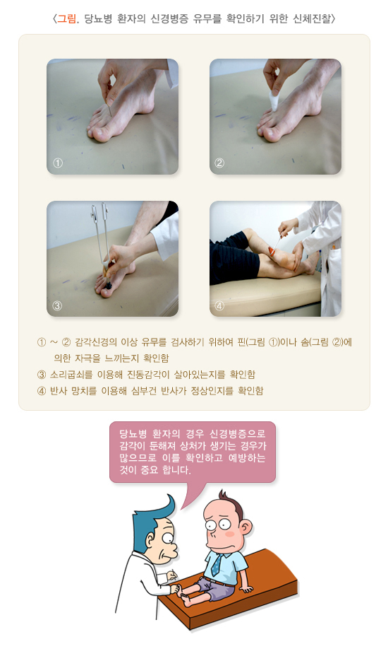 당뇨병성 신경병증을 선별하기 위해 몇 가지 도구를 이용한 검사를 받아 볼 수 있습니다. 소리굽쇠를 이용한 진동감각 검사, 핀을 이용한 통증감각 검사, 나일론 모노필라멘트라는 기구를 이용한 발의 보호감각(압력감각) 검사, 반사 망치를 이용한 심부 건 반사 검사 등이 있습니다.