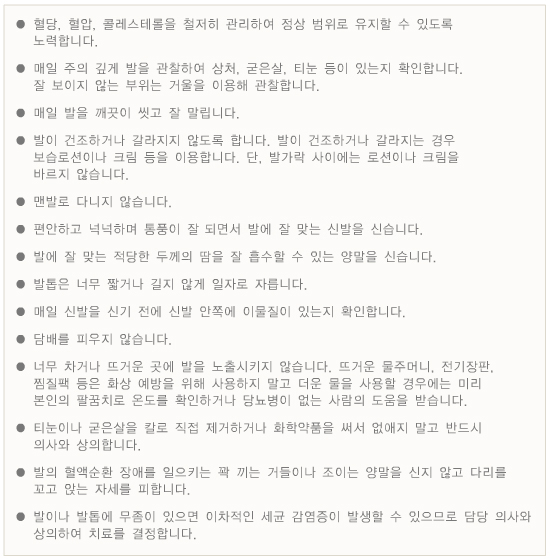 당뇨병성 족부병증이 생기는 것을 예방하기 위해 당뇨병 환자들이 지켜야 할 사항은 다음과 같습니다.