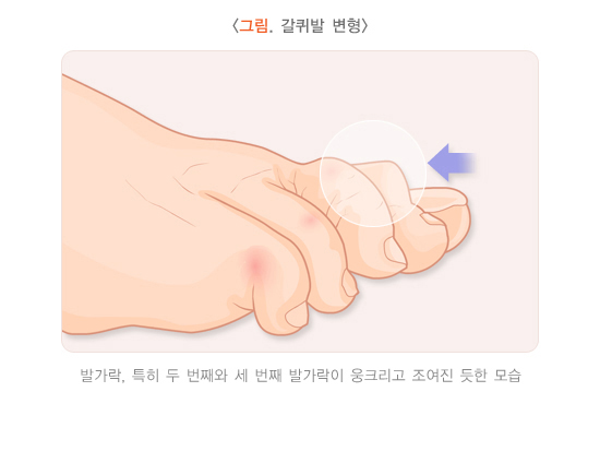 운동신경에 이상이 생기면 발의 작은 근육들의 작용에 문제가 생겨 발 모양이 변하게 됩니다(예: 갈퀴발). 발 모양이 변하면 갈퀴 발가락의 등 부위나 발가락 끝, 엄지발가락 아래 발허리뼈머리(중족골두) 부위 등에 지속적으로 압력을 받게 됩니다.