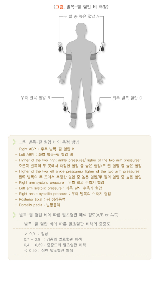 정상인은 다리의 수축기 혈압이 팔의 수축기 혈압보다 높습니다. 이 점을 이용해 발목과 팔에서 측정한 수축기 혈압을 비교해서 말초혈관질환이 있는지를 추정할 수 있습니다. 발목-팔 혈압 비는 말초혈관질환을 진단하는 데 있어 간단하면서도 의미 있는 정보를 제공해 줄 수 있는 방법입니다.