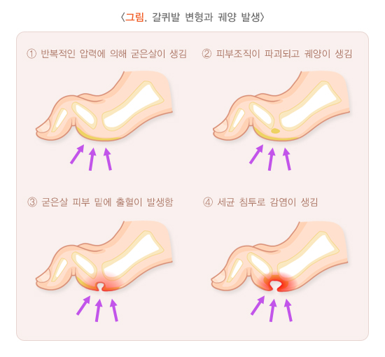 같은 부위에 계속해서 압력을 받으면 굳은살이 생기고 그 아래에서 출혈이 생기며, 피부조직이 파괴되어 결국 궤양이 생기게 됩니다. 발바닥에 굳은살이 있는 경우, 없는 경우와 비교해 발 궤양이 생길 위험성이 11배 정도 높습니다.