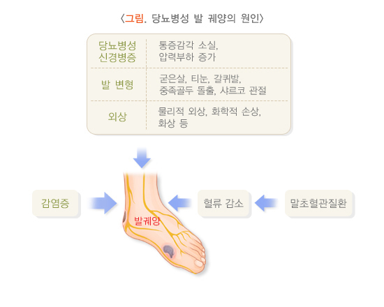 말초혈관질환 역시 발 궤양의 원인이 될 수 있습니다. 발 궤양을 가진 당뇨병 환자의 약 1/3이 말초혈관질환을 가지고 있습니다. 당뇨병 환자에게 동반되는 말초혈관질환은 무릎 동맥 아래 부위의 가는 동맥에 주로 생기며, 당뇨병이 없는 사람에게 생기는 경우와 비교해 훨씬 정도가 심하고, 범위가 넓습니다.