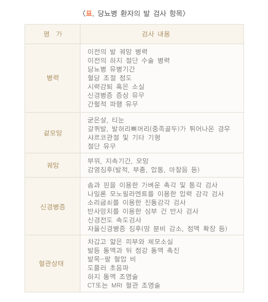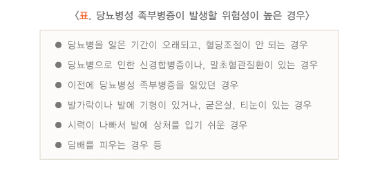 당뇨병성 족부병증이 발생할 위험성이 높은 경우를 정리하면 다음 표와 같습니다.