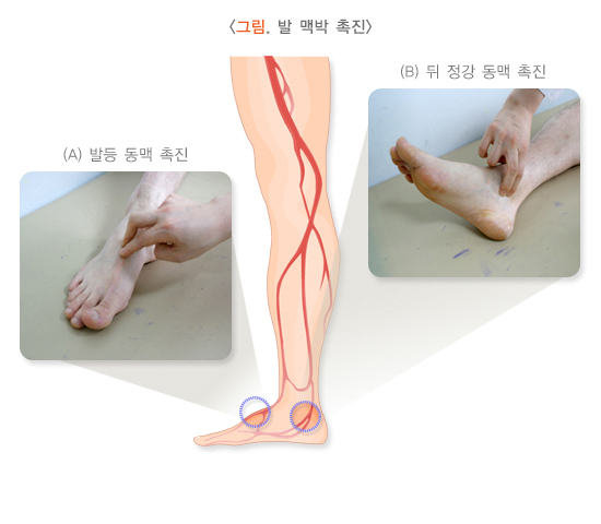 발의 혈액순환에 문제가 있는지를 가장 간단하게 확인해 볼 수 있는 방법은 발등과 복숭아뼈 부위의 맥박을 만져보는 방법입니다. 말초혈관질환 유무를 가장 간단하게 확인할 수 있는 방법이지만, 말초혈관질환이 있어도 촉진되는 경우가 있으므로 주치의와 상의하시는 것이 좋습니다.