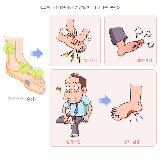 감각신경 이상이 있는 경우 이상 감각이 나타날 뿐 아니라, 통증과 차갑고 뜨거운 감각을 느끼지 못하는 경우도 있습니다. 감각이 저하되면 이물질에 의한 상처나 발에 맞지 않는 꽉 끼는 신발 등으로 인한 압력을 잘 느끼지 못하기 때문에, 발에 상처가 생기기 쉽고 상처를 발견하는 것이 늦어지게 됩니다.