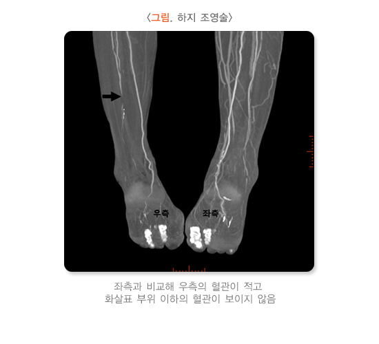 하지 동맥 조영술은 혈관이 좁아지거나 막혀 있는 것을 육안으로 확인하기 위한 방법 중 하나로, CT나 MRI를 이용한 혈관 조영술을 시행할 수 있습니다.