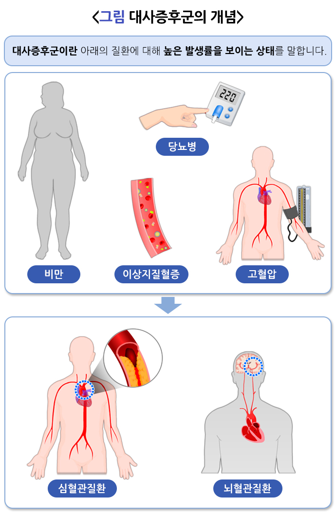 대사증후군은 심혈관질환, 당뇨병, 뇌졸중 등의 위험을 높이는 이상 소견이 복합적으로 나타나는 상태입니다.
