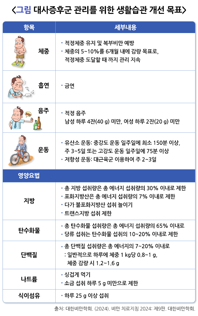 흡연은 동맥경화 및 혈전 생성을 촉진해 심뇌혈관질환의 위험을 높이며, 인슐린 저항성의 증가와도 관련됩니다. 대사증후군 환자가 심뇌혈관질환을 예방하거나 치료하려면 반드시 금연해야 합니다. 과량의 알코올 역시 심뇌혈관질환 위험을 높이므로 절주하는 것도 중요합니다. 생활습관 개선에 관한 내용은 아래 ‘대사증후군 관리를 위한 생활습관 개선 목표’와 같습니다.