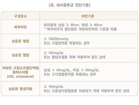 다음 다섯 가지 기준 중 세 가지 이상을 충족할 때 대사증후군으로 정의합니다.