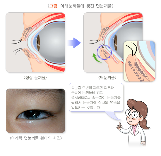 덧눈꺼풀이란 속눈썹 주변의 과도한 피부와 근육(눈둘레근)이 눈꺼풀테 위로 겹쳐짐으로써 속눈썹이 눈 안쪽으로 밀려들어가 안구를 자극하는 질환입니다.