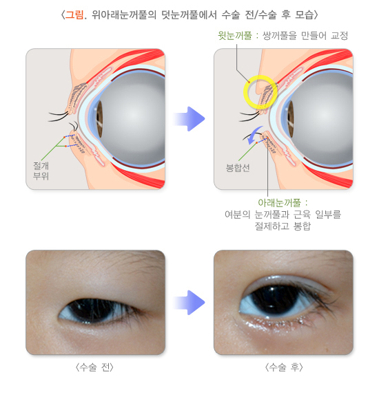 덧눈꺼풀교정술은 자연스러운 눈 모양을 유지하면서 속눈썹의 방향이 정상이 되도록 수술을 통해 교정하는 치료입니다. 대부분 소아 환자이므로 전신마취 하에 시행되며 덧눈꺼풀의 원인이 되는 과도한 피부와 근육 일부를 절제하고 회전 봉합하여 속눈썹이 바깥쪽으로 향하게 합니다. 위눈꺼풀에 덧눈꺼풀이 있는 경우에는 쌍꺼풀을 만들어 속눈썹이 바깥쪽으로 자연스럽게 밖으로 향하도록 합니다. 수술 후 봉합 부위에 항생제 연고를 바르고 물이 들어가지 않도록 주의합니다.