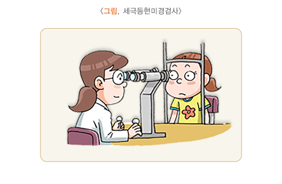 - 세극등현미경검사: 덧눈꺼풀의 유무와 정도, 눈썹찔림으로 인한 각막의 손상 여부 및 정도를 확인합니다.