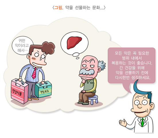 그러므로 모든 약물은 효능뿐만 아니라 부작용에 대해서도 신중히 고려해야 합니다. 전문의가 처방한 약물 외에 불필요한 약제의 사용을 자제하고, 한의원을 통하지 않고 비공식적인 경로로 구입한 한약이나 건강보조제, 민간요법을 되도록 피해야 합니다. 다시 말해, 모든 약은 꼭 필요할 경우에만 복용해야 합니다. 우리 나라에서는 건강을 기원하며 약을 선물하는 경우가 많은데, 간 건강을 위해서는 한 번 더 생각할 필요가 있습니다.