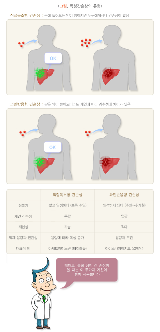 독성 간 손상은 몸에 들어오는 독소의 양이 많아지면 누구에게나 발생하는 직접 독소형 간 손상과, 같은 약을 섭취해도 특정 개인에서만 간 손상이 발생하는 과민 반응형 간 손상으로 나뉩니다.