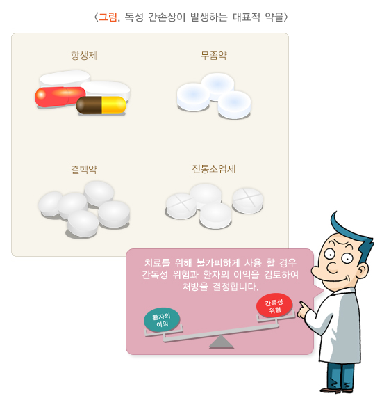 우리나라에서는 독성 간 손상의 가장 흔한 원인으로 약물, 한약, 건강보조제, 민간요법 등 네 가지가 있습니다. 약물은 임상시험을 거치기 때문에 간 손상의 위험성이 비교적 잘 알려져 있습니다. 의사로부터 처방 받아 복용하는 약 중에서 독성 간 손상을 일으킬 수 있는 대표적인 약물로는 항생제, 항진균제(무좀약), 결핵약(아이소나이아지드), 진통소염제 등이 있습니다. 따라서 이들 약물을 복용할 때는 독성 간 손상의 발생 여부를 세심히 관찰하고, 필요한 경우 추적 검사를 시행해야 합니다. 또한 모든 약제를 복용할 때는 반드시 필요한 약제만 적절한 용량과 기간 동안 섭취해야 합니다. 치료를 위해 복용한 약물이라도 용량이 부적절한 경우 독성을 유발할 수 있으며, 때로는 용량과 무관하게 간 손상이 발생할 수 있기 때문입니다.
