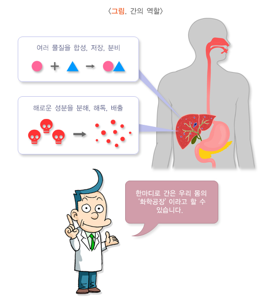 간은 우리가 섭취하는 모든 음식물로부터 얻은 성분을 영양분으로 변환하여 몸에 공급하며, 필요하지 않거나 해로운 성분을 분해, 해독하고 배출하는 역할을 담당하는, 이른바 '우리 몸의 화학공장'입니다. 간은 알부민을 포함한 다양한 단백질과 혈액응고인자, 콜레스테롤의 합성, 탄수화물 및 아미노산의 대사, 혈당 조절, 면역 기능 조절 등 우리 몸의 필수적인 역할을 수행합니다.