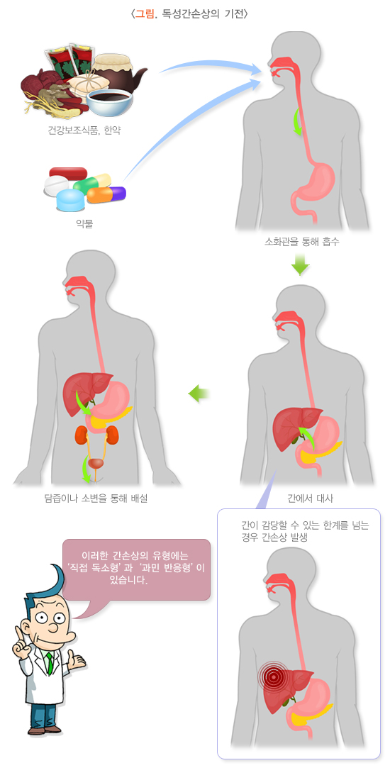 우리 몸에 들어온 약효 성분과 영양 성분은 대부분 간에서 대사 및 전환 과정을 거쳐야 비로소 체내에서 작용할 수 있습니다. 이 과정은 화학적으로 매우 복잡한데, 특정 약물이나 음식물의 대사/전환 과정이 간이 감당할 수 있는 한계를 넘어서거나 중간대사물질이 독성 물질로 작용하게 되면 독성 간 손상이 발생할 수 있습니다.