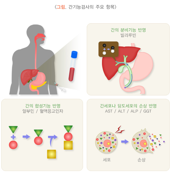 간질환은 초기에는 증상이 없거나 비특이적 증상(피로, 식욕부진, 소화불량 등)만 나타나는 경우가 많습니다. 간 손상이 상당히 진행된 후에야 황달, 복수와 같은 특이적 증상이 나타난다는 점이 간질환의 중요한 특징입니다. 독성 간 손상 역시 증상만으로는 진단이 어렵습니다. 간질환(또는 간 손상)을 진단하는 데 가장 널리 사용하는 검사는 AST(SGOT)나 ALT(SGPT)를 포함하는 간기능검사(혈액검사)입니다. 간기능검사는 항목마다 의미가 조금씩 다르며, 한 가지 항목을 한 번 보고 판단하기보다 종합적으로 평가해야 합니다. 예컨대 AST 및 ALT는 간세포 내에 존재하는 효소로, 간세포가 손상되면(소위 간세포가 깨지면서) 혈액으로 방출되어 수치가 상승합니다. 마찬가지로 ALP(Alkaline Phosphatase) 및 GGT(gamma-glutamyl transferase)는 담관세포가 손상되거나 담즙이 배출되는 담도가 정체 혹은 폐쇄되었을 때 상승합니다. 간 손상이 심하면 간에서의 분비 기능을 반영하는 빌리루빈이 상승하여 황달이 발생하고, 간의 단백질 합성 기능을 반영하는 혈청 알부민 수치가 감소하며, 간의 혈액응고인자 합성기능을 나타내는 프로트롬빈 타임(prothrombin time, PT)이 길어집니다.