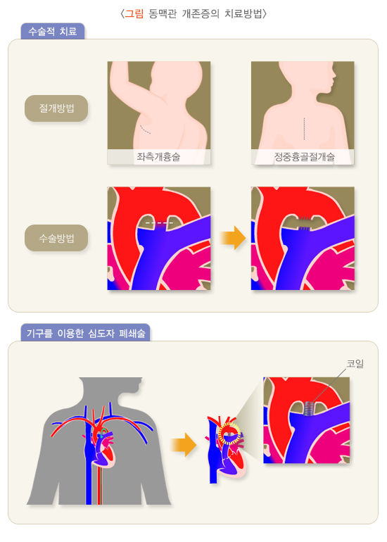 치료 방법으로는 크게 수술과 시술 2가지가 있습니다. 수술은 전신마취를 하고 가슴을 열어(개흉) 동맥관을 묶거나 자르는 방법입니다. 대부분 왼쪽 갈비뼈 사이 공간을 여는 좌측개흉술을 시행합니다. 동맥관 개존증 외에 동반된 심장 기형도 수술해야 하거나 대동맥, 동맥관의 위치가 정상과 다른 경우 가슴 가운데 복장뼈(흉골)를 여는 정중흉골절개술을 시행하기도 합니다.