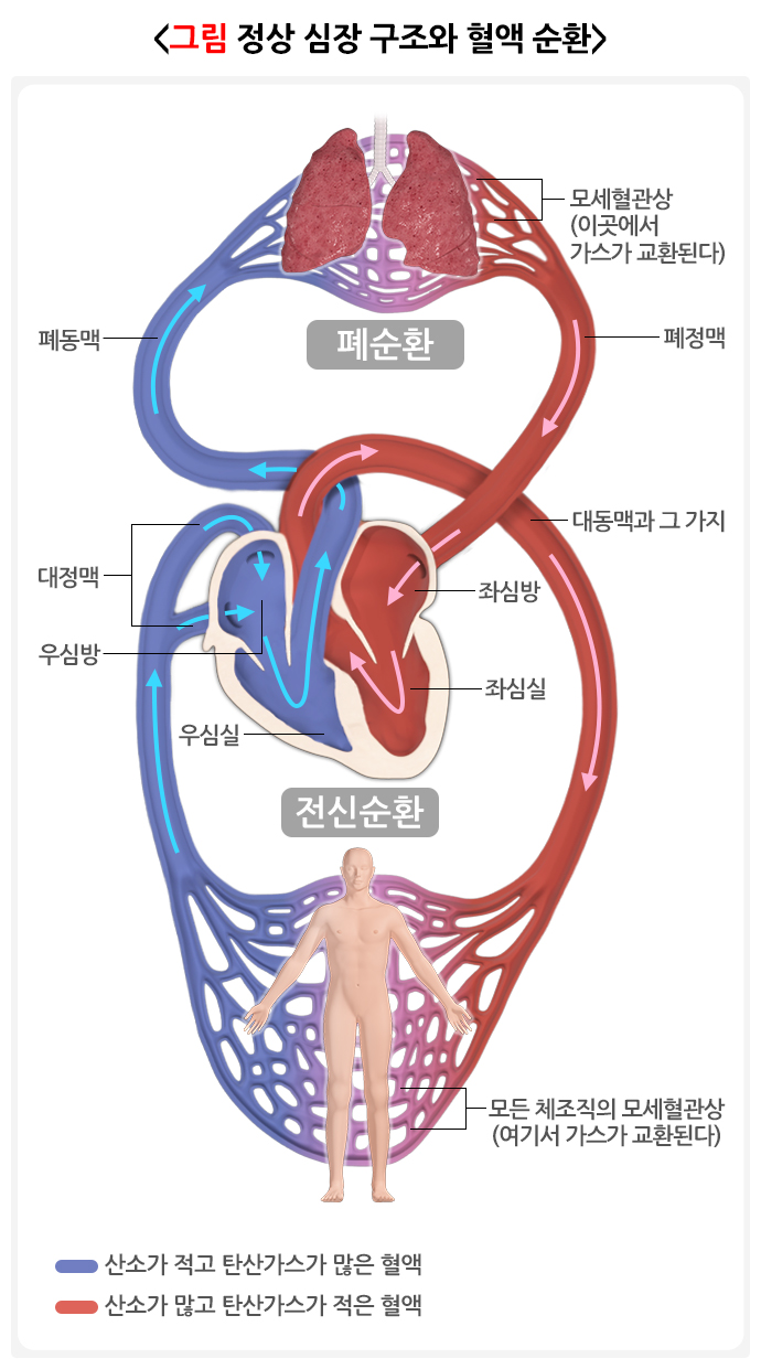 정상 심장은 우심방, 우심실, 좌심방, 좌심실 등 4개의 방으로 이루어져 있습니다. 좌심실에서 뿜어져 나온 피를 동맥혈이라고 하며 산소를 많이 함유하고 있어 선홍색을 띱니다. 좌심실에서 나온 동맥혈은 대동맥을 통해 온몸에 산소와 영양을 공급하는데, 이를 체순환이라고 합니다. 체순환을 통해 온몸에 산소를 공급하고 나면 피 속의 산소가 적어져 검붉은 색을 띠게 됩니다. 이렇게 체순환을 거쳐 정맥을 통과하는 피를 정맥혈이라고 합니다. 정맥혈은 다시 우심방으로 모인 후 우심실을 거쳐 폐로 들어가고, 호흡을 통해 산소를 얻게 되면 다시 동맥혈로 변합니다. 좌심방을 거쳐 좌심실로 들어간 동맥혈이 좌심실의 강력한 수축에 의해 대동맥으로 뿜어져 혈액 순환이 완성됩니다.