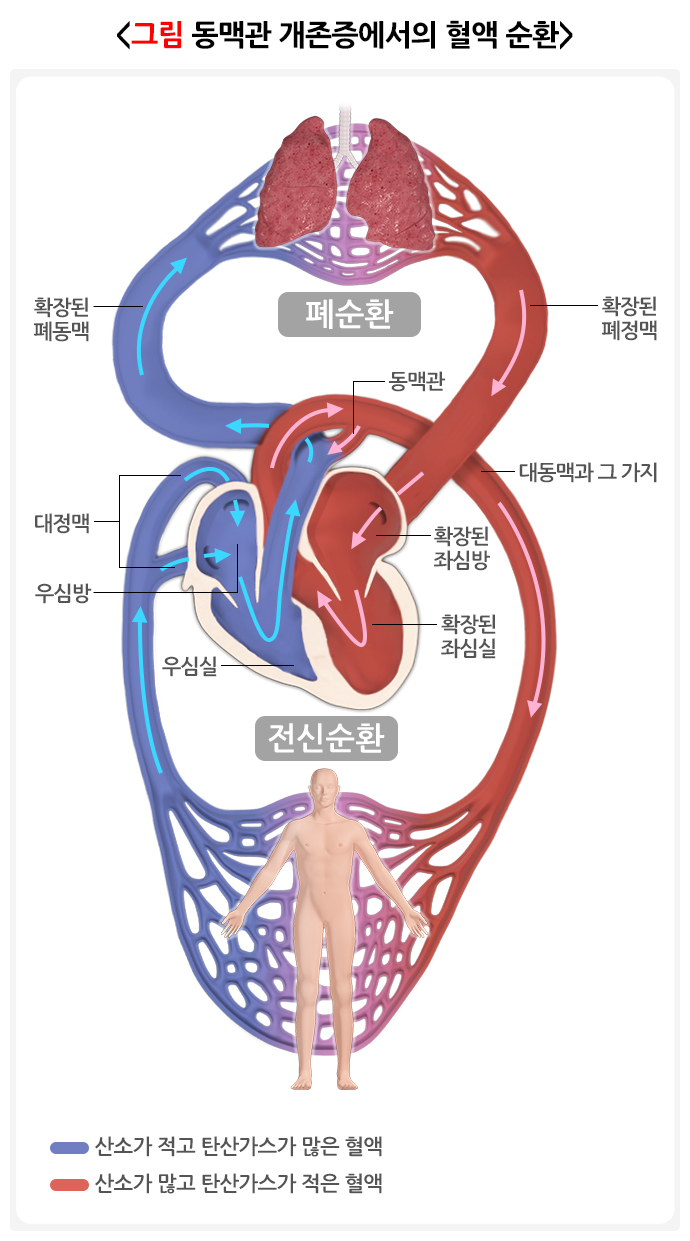 동맥관이 열려 있으면 대동맥 피의 일부가 압력이 높은 대동맥에서 압력이 낮은 폐동맥으로 넘어갑니다. 이에 따라 폐로 가는 피의 양이 많아져 폐에 부담이 됩니다. 좌심방, 좌심실, 대동맥을 흐는 피의 양도 많아지므로 심장에도 부담이 됩니다(화살표 참조).