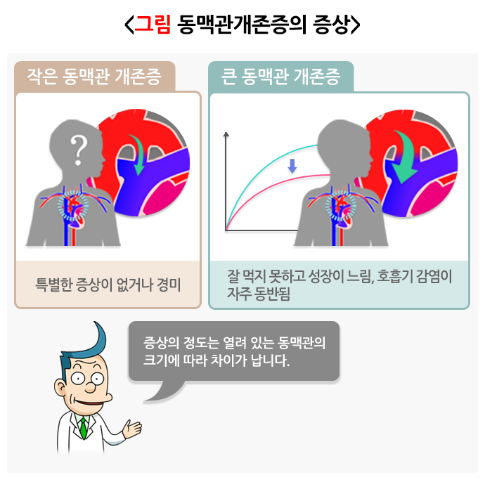 ● 동맥관의 크기가 크면 만 1세 이전 영아기부터 숨쉬기 힘든 심부전 증상이 발생합니다.