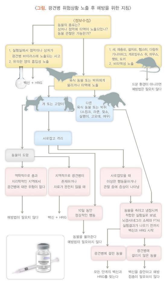 동물에게 물린 후 공수병 예방조치를 해야 하는지 판단하기 위해 다음과 같은 사항을 고려해야 합니다. 사건이 일어난 곳의 지리학적 위치, 동물의 종류, 그리고 노출이 발생한 형태, 동물의 예방 접종 여부, 광견병 검사를 위해 동물을 안전하게 잡았는지 등입니다.