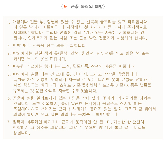 쏘인 부위를 심장보다 낮은 위치에 놓음으로써 독소가 심장으로 유입되는 속도를 늦출 수 있습니다. 쏘인 부위에 가려움과 통증만 있는 국소증상만 있는 경우는 피부에 스테로이드 연고를 바르면 가려움증에 도움이 되고, 진통제는 통증을 줄이는 데 도움이 됩니다. 기존에 벌 독 알레르기가 있는 사람이거나 벌에 쏘인 후에 몸이 붓고, 가렵고, 피부가 창백해지고, 식은땀이 나는 증세, 두통, 어지럼증, 구토, 호흡곤란, 경련 및 의식 저하 등의 전신 과민반응이 나타나면 즉시 필요한 응급조치를 시행하면서 신속히 의료기관을 방문해야 합니다.