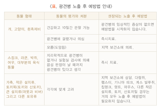 사람을 문 개나 고양이 또는 흰 족제비를 가두고 10일간 관찰해야 하며, 관찰하는 동안 광견병의 증상이 나타나는지 주의 깊게 살펴보아야 합니다. 만약 사람을 물었던 동물이 죽었으면 냉동이 아닌 냉장의 상태로 병원으로 가져와야 합니다. 이때 머리, 뇌 부분이 손상되지 않도록 하는데, 이것은 필요하면 동물의 뇌에서 광견병 바이러스를 추출해야 하기 때문입니다.