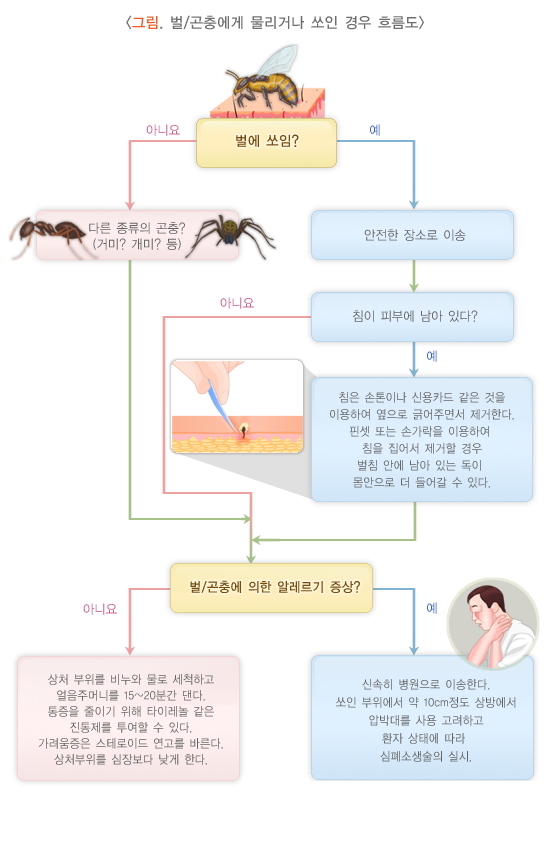 벌에 쏘였을 때 우선 더 이상의 쏘임을 방지하기 위해 환자를 벌이 없는 안전한 곳으로 이동시킵니다. 피부에 벌침이 박혀 있는지를 살펴본 후 침이 피부에 남아 있으면 침을 손톱이나 신용카드 같은 것을 이용해 피부와 평행하게 옆으로 긁어주면서 제거합니다. 핀셋 또는 손가락을 이용해 침의 끝부분을 집어서 제거하려고 하는 행위는 독주머니를 짜는 행위가 되어 오히려 벌침 안에 남은 독이 더 몸 안으로 들어갈 수 있어 주의해야 합니다. 침이 피부에 없거나 제거한 후에는 벌에 쏘인 자리를 비누와 흐르는 물로 씻어 감염을 예방합니다. 쏘인 부위에 얼음주머니를 15~20분간 대주면 붓기를 가라앉히고, 통증 감소 및 독소의 흡수 속도를 느리게 할 수 있습니다.
