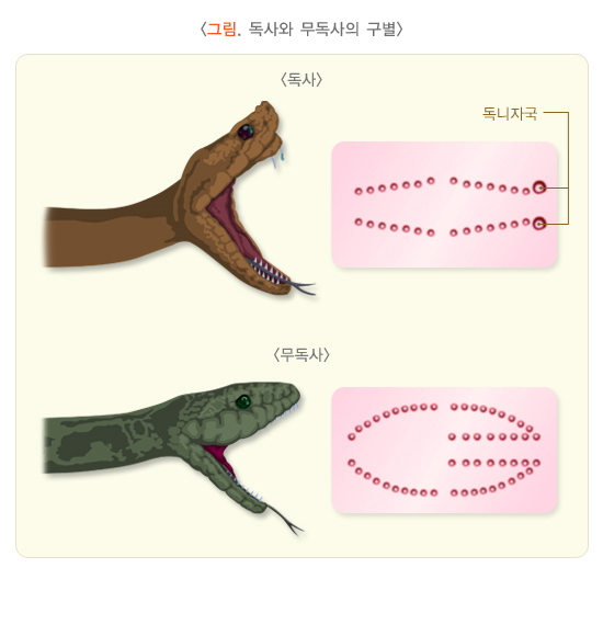 뱀은 크게 독이 있는 독사와 독이 없는 구렁이 등으로 나눌 수 있습니다. 독사와 구렁이는 뱀의 머리 생김새, 눈동자 모양 그리고 물린 부위의 이빨 자국으로 감별할 수 있습니다. 독사의 머리는 위에서 보았을 때 삼각형인데 구렁이는 비교적 둥근 모양입니다. 독사의 이빨은 두 개이고, 구렁이는 이빨이 많아서 물린 부위의 모양을 가지고 판단하는 경우가 많습니다,