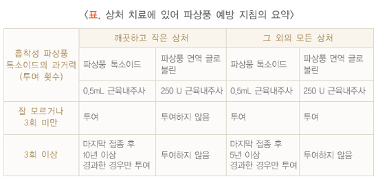 파상풍 예방 지침은 상처 정도와 과거 파상풍 예방접종 경력과 시기에 따라 결정됩니다.