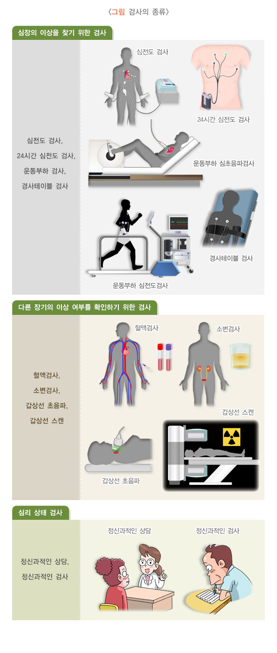 그 밖에 운동부하 검사와 경사테이블 검사 등이 있는데, 운동부하 검사는 협심증, 심근경색증 등이 있는지를 확인하는 검사이고, 경사테이블 검사는 실신 등을 호소하는 사람들에게 실시하는 증상 유발 검사입니다. 경우에 따라서는 심장초음파 검사나 심혈관 도자 검사 등 심장에 대한 보다 정밀한 검사를 실시하기도 합니다. 부정맥을 유발시키는 전신 질환의 감별을 위해 갑상샘 기능검사, 빈혈검사 등을 시행합니다. 갑상샘항진증이 발견되면 갑상샘 초음파, 특수 갑상샘 스캔 등의 검사를, 빈혈이 발견되면 빈혈 원인에 대한 검사를 추가로 시행합니다. 정신적 원인에 의한 두근거림이 의심되는 경우, 불안장애나 스트레스 장애 여부를 알기 위한 설문지 검사나 정신과적인 상담이 필요합니다.