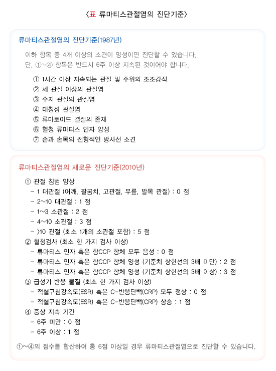 2010년 미국 류마티스학회가 개정한 류마티스관절염의 분류 기준을 이용하여 류마티스 전문의의 진찰 하에 진단을 하게 됩니다. 류마티스관절염을 확진할 수 있는 한 개의 혈액검사나 신체검사 소견은 없습니다. 진단은 류마티스 전문의의 자세한 병력 청취와 신체검사 등 임상적인 소견을 종합하여 이루어집니다. 혈액검사는 확진에 도움을 줄 수 있습니다. 관절의 부종과 같은 염증 소견은 진단에 필수적이며, 침범한 관절의 분포도 진단에 중요한 단서를 제공합니다.