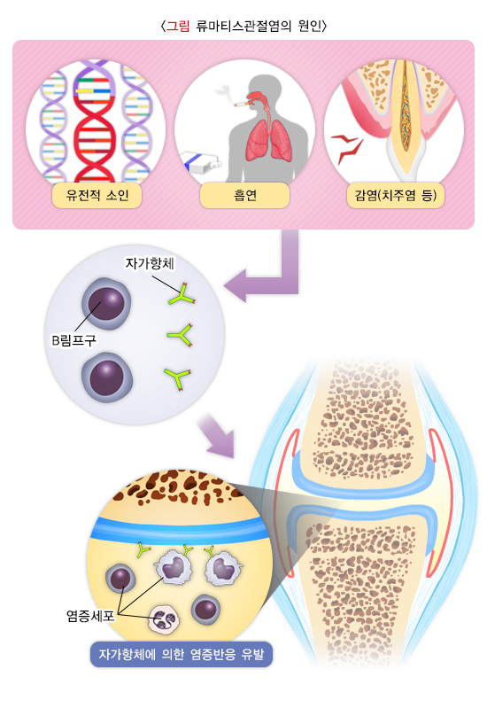 면역은 외부에서 침입하는 세균으로부터 우리 몸을 막아주는 기능을 말하며 면역에서 림프구는 중요한 역할을 합니다. 그러나 림프구가 우리 몸의 일부를 외부에서 침입하는 세균으로 잘못 인식하면 여러 가지 병이 생기게 됩니다. 이것을 자가 면역 질환이라고 하는데, 류마티스관절염은 자가 면역 질환으로 림프구가 우리 몸의 일부인 관절을 공격하고 결국 관절과 관절 주위의 뼈를 파괴합니다. 이러한 반응은 피로감, 발열, 식욕 부진, 체중 감소 등 전신적인 증상의 원인이 됩니다.
