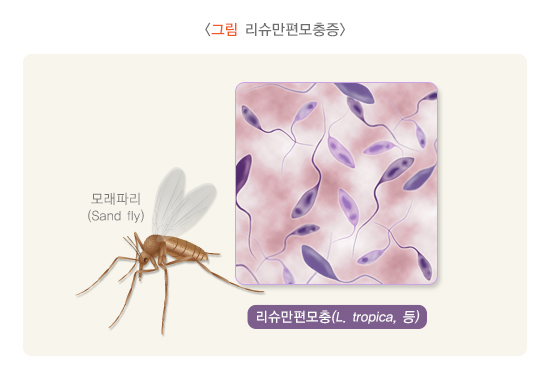 리슈만편모충(Leishmania spp.) 감염에 의한 피부, 내장, 피부 점막에 생기는 기생충 질환입니다.