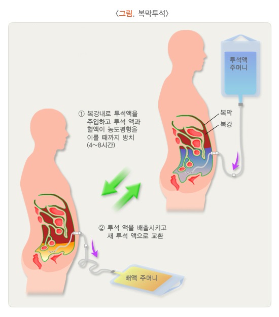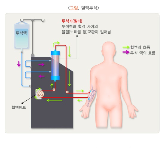 위와 같은 치료를 지속하였음에도 불구하고 콩팥 기능 저하가 진행되어 정상 콩팥 기능의 15% 미만에 해당하는 말기 신부전에 이르게 되면 신 대체요법에 대한 준비가 필요합니다. 신 대체요법에는 투석과 이식이 있으며, 투석은 다시 혈액 투석과 복막 투석으로 나뉩니다. 신 대체요법의 선택은 담당 주치의와 충분한 의사 소통을 통해 결정하는 것이 바람직합니다.