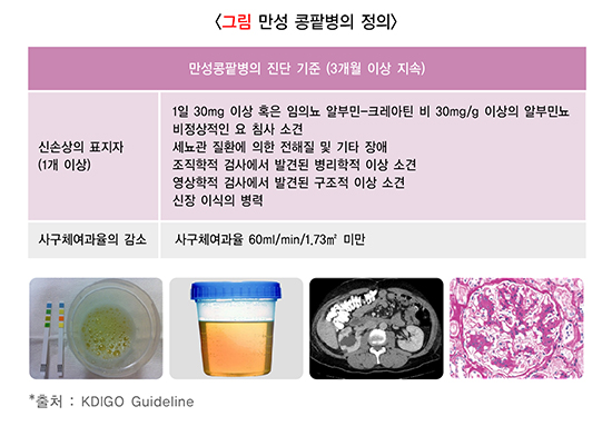 만성콩팥병은 3개월 이상 지속적으로 콩팥기능의 감소를 보이거나 혹은 콩팥 손상의 근거가 있는 경우로 정의합니다.