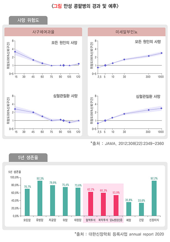 만성콩팥병이 있으면 심혈관계 합병증 및 그로 인한 사망, 그리고 총 사망률이 모두 높아집니다. 이러한 사망률의 증가는 사구체 여과율이 낮을수록, 알부민뇨가 많아질수록 높아지는 것으로 알려져 있습니다.